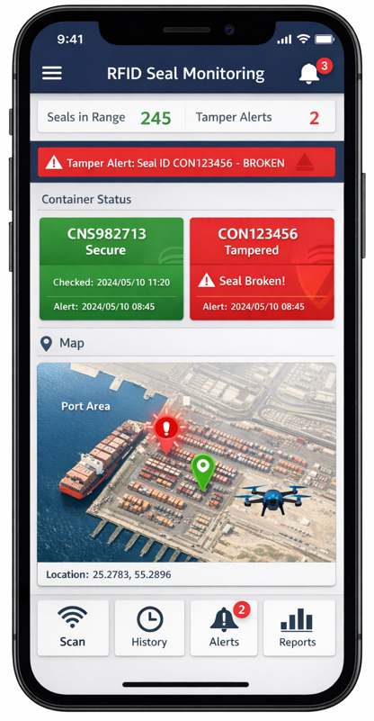 Our intelligent solution combines semi-active electronic seals, drone-based RFID inspection, and a real-time mobile application platform to create a fully automated container security system.